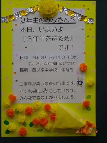 今朝,3年生の教室には,在校生からのメッセージが掲示されていました。体育祭の縦割りの色に合わせた花束には,送る会を成功させようという後輩たちの思いがあふれています。