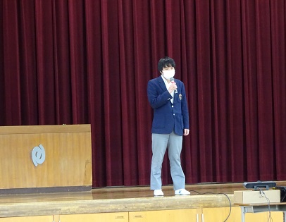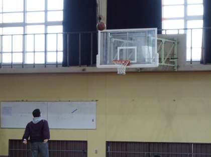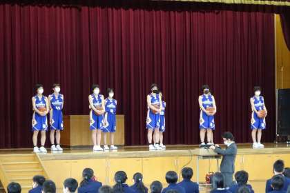 CS部,女子バスケ部の紹介です。最後は,女子バスケ部の顧問がシュートの見本を見せたものの,外してしまい無念でした。
