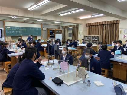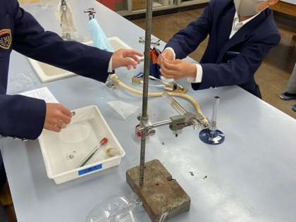 さて,写真は2年生の理科の時間です。酸化鉄を使った化学反応の実験です。グループ学習の場面が制限されていますが,その中でも一生懸命学習に向き合う君たちは素敵です。
