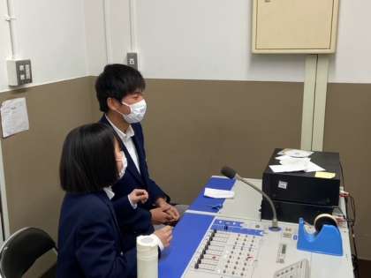 今日はお昼の放送の裏側に潜入しました。たくさんのスイッチがあって,何が何だかわからなかったのですが,手際よくスイッチを押していました。すごかったです。生徒会本部の2人も,マイクのスイッチが入った途端にテンションが変わったので感動しました。