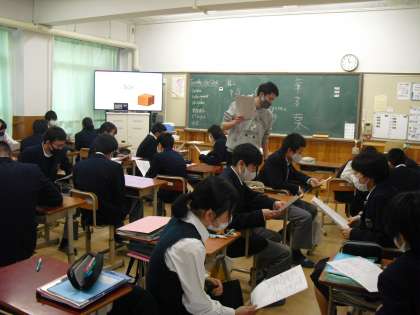 続きまして3年生です。1年生から3年生の教室に入らせてもらうと,急に体が大きくなったように感じます。2組は英語,3組は理科,4組は美術,5組は社会の授業でした。理科の授業では,温暖と寒冷の仕組みを先生と生徒が役になって説明していたのが印象的でした。社会の選挙権の学習も,実に興味深かったです。