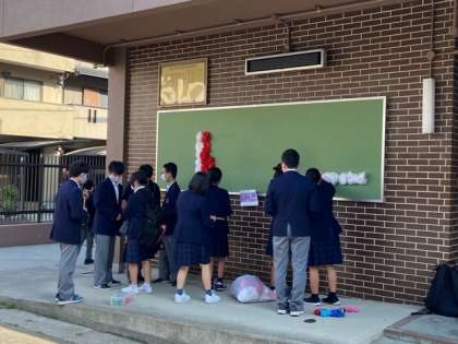 文化委員会では,毎月,季節にあった装飾を作成しています。5月は2年生の文化委員が中心となって作成しました。掲示板に画びょうがなかなか刺さらず苦労したようですが,立派な作品が完成しました。6日の登校時に君たちを迎えてくれます。