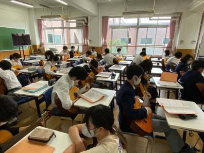 今日は,4時間目の数学,5時間目の英語,6時間目の音楽にお邪魔しました。数学は,先生のひねった問題に対して,近くの人と相談する姿が印象的でした。次に,英語。ALTの先生に話す文章を作文していましたが,先生によるとそれを話すのは普通で,ALTの先生の質問に答えることが大事なようで・・・ハイレベルでした。最後に音楽,ギターを弾いていました。4回目とは思えない器用さでした。