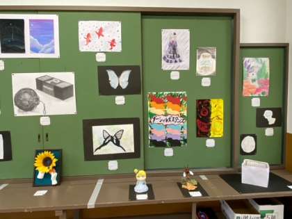 作品は,造形・鉛筆での作品・アクリルガシュでの作品など,多岐にわたるものでした。それぞれの作品に,作成者の心が書いてあり,1つずつ見入ってしまいました。どの作品もとても印象に残ったのですが,先生なりの金賞・銀賞・銅賞を考えました。