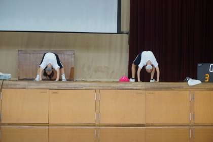 答えは立ちブリッジ。立ったままの姿勢からブリッジにもっていきます。結構,難しいです。その後,3組Yさんと5組Tくんがロンダート,3組Nさんは片手側転を披露します。足先まで伸ばして美しいです。