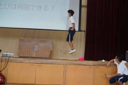 次は,「3組Uくんは二重跳びを何回できるか?」これは,Uくんが実際に実演。緊張のためか,本来の実力が出せませんでした。また,披露して下さい!