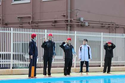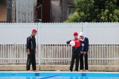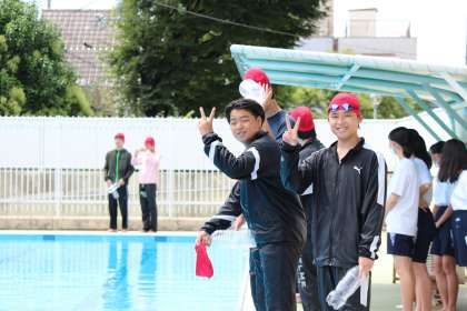 3年生の保健体育の授業では,着衣水泳が行われました。2年生の球技大会を見に行こうと思ってグランドに向かっていたら,プールサイドに服を着ていた人が多く立っていたので一瞬ビックリしました。