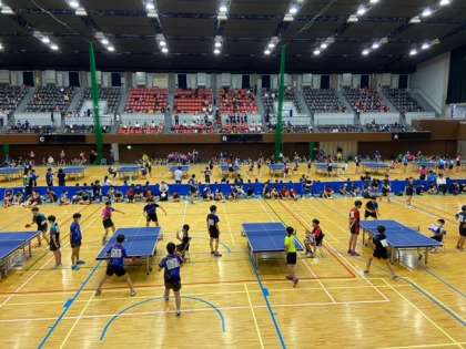卓球部の団体戦は,京都市体育館で行われました。男子は49校,女子は37校の参加です。ベスト4のチームが府大会へ出場します。団体戦はシングル対決が4試合,ダブルス対決が1試合,計5試合行い,3ゲームをとった方が勝ちです。シングルでも,どのような順番で出場するのか,試合ごとに変えることができます。なので,オーダー順も大切な部分を占めていて,顧問の先生はあれこれと想定しながらオーダー順を決めていきます。