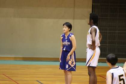 ティップオフして直後から留学生にボールが集まります。必死にジャンプしますが,届きません。楽々とシュートを決められます。しかし,西ノ京もFさん(3年2組)の3Pなどで応戦。開始30秒で7−13というスコアになりました。