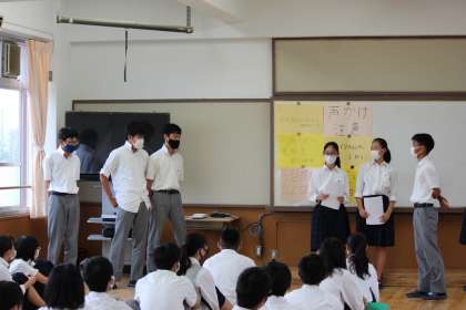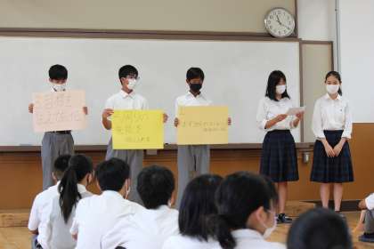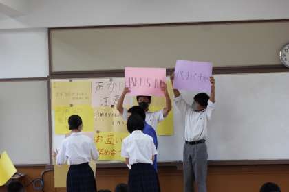 午前最後の活動は、グループごとに話し合った内容の交流会です。1時間ほどの時間で、話合い、まとめ、発表の形まで準備されており、みなさんの能力の高さを感じました。班によっては劇形式での発表もあり、それぞれの班の発表内容にひきつけられました。ある班では、実際にやる気を持てない人たちのロールプレイを行うことで、新たな気付きがあったようです。自分たちがリーダーとして、現実的に何ができるのか、この活動を通して見えてきたのではないでしょうか。(そして、この話合い活動中も密かに「盛り上げ班」大活躍!発表のたびに「拍手!」のプラカードを掲げ、雰囲気を高めていました。意見を生み出すだけでなく、その意見を発表しやすい雰囲気作りも、リーダーとして大切だということに気づかされます。)
