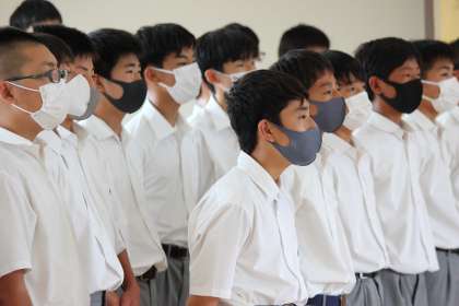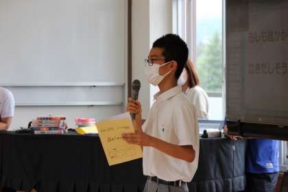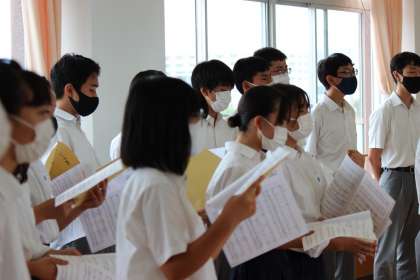 いよいよ合唱です。曲は「Believe」。たった1時間の練習とは思えない素敵な仕上がりでした。マスク越しではありますが、一人一人の真剣な表情が伝わってきます。初めは楽譜を見ながら歌っていましたが、曲が進むにつれ、周りから聴こえてくる仲間の歌声を信じ合い、最後にはみんなが顔をあげて歌っていました。曲が終わった後の全員の達成感に満ちた表情が美しかったです。たった半日の間に、リーダーたちの中で絆が生まれているのが、見ている先生たちにも伝わってきました。この合唱で得たものを、必ず学級に広めていこうという合唱班からの決意の一言をもって、合唱の取組に幕を下ろしました。