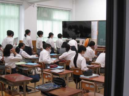 タブレットを使用した授業が当たり前のようになってきた今日この頃、朝の学活での動きは、まず健康観察に始まります。その後に、生徒たちは各自のタブレットを整然と効率よく充電保管庫から取り出し、1日の授業に備えます。毎日の動きのため、起動やログインなどお手のものになってきました。このような様子が日常になりつつあります。