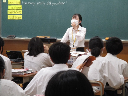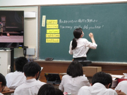 教育実習生の授業が始まっています。1年生の英語の授業です。英語の歌を紹介してくれたり、イラストを使って説明したり工夫のある授業で頑張っています。