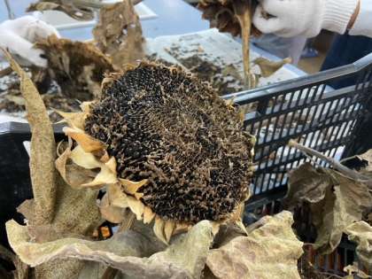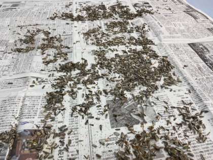 大きな花びらを咲かせたくれた,はるかのヒマワリ。その種の取り出し作業を,環境美化委員長と,1・2年生の環境美化委員で行いました。たった1粒の種から,いっぱいの種が取れましたが,途方もない大変な作業でした。環境美化委員の皆さん,ありがとうございます。