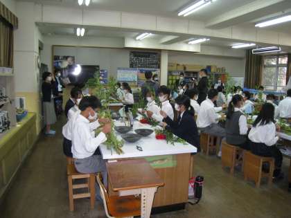 本日、日本の伝統文化を真近に触れようということで、華道・いけばな教室が行われました。今日は、1組・2組・5組の3クラスが、理科室と図書室を使用して56時間目に取り組みました。華道・いけばな教室では「松月堂古流」植松 賞月斎 先生と弟子のかた数人で丁寧に華道について、講演といけばなの実習を行っていただきました。各人に花器・剣山・鋏が用意され、感性にしたがいながら各自思い思いに花を活けました。完成した作品は、写真に撮り、使用した花については、持ち帰りました。なお、3組と4組については、20日水曜日に行われる予定です。