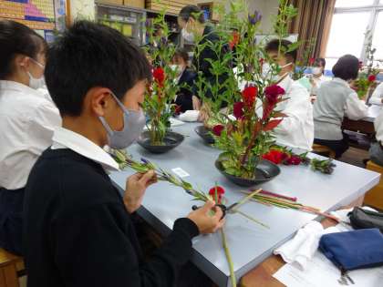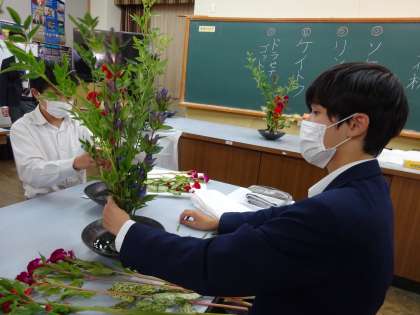 今日は2年生1組,2組,5組が華道生け花教室を行いました。講師の先生から生け方や花や葉の向きによって見え方が違ってくることを実践していただきそれをお手本に一人ひとりが個性あふれる作品を作ることができました。剣山や専用のはさみなど初めて手にし、戸惑っているとそっと講師の先生からアドバイスをもらっていました。全員が同じ花を使っているのに関わらず、表情の違った生け花が完成していました。そしてなにより、真剣に打ち込んでいる生徒のみんなの表情や完成した時の笑顔がとても素敵でした。次は水曜日に3組、4組が取り組みます。