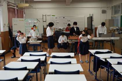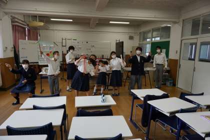 今回のプログラムは1つめがピアノの「もしもしかめよ」のリズムに合わせて,けん玉とコマによる得意技の披露です。皆,休み時間などを利用して,練習した技を楽しんで披露する事が出来ました。そして,メインイベントはキーボード,ピアノ,アルトリコーダー,木琴,トライアングル,小太鼓,カホン,そしてダンスも付いた「おどるポンポコリン」の合奏です。初めて手にする楽器もある中,この日のために6月から練習を続けてきました。本番はとても緊張しましたが,思わず見ている方も歌いだしたくなるような,躍動感あふれる素敵な演奏でした。