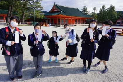 お昼ご飯を食べた後、平安神宮にやって来ました。皆んなでお参りをしておみくじを引きました。1組の皆んなに幸せな事がたくさんありますよーに!!