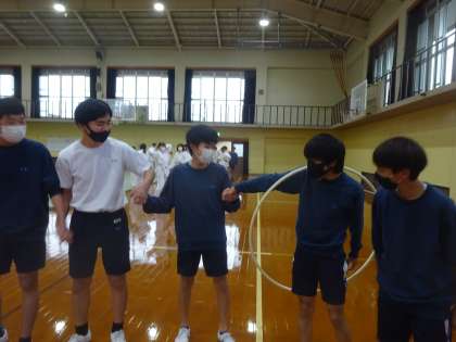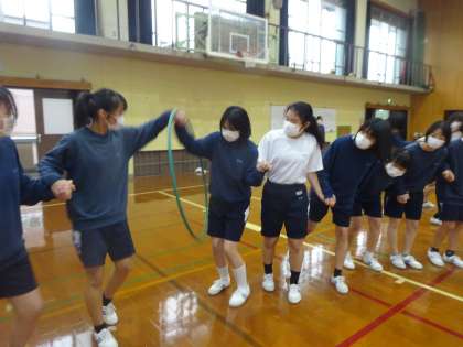 体育レクリエ—ションに向けて,フラフープ送りの練習をしています。