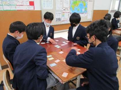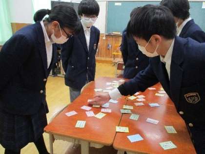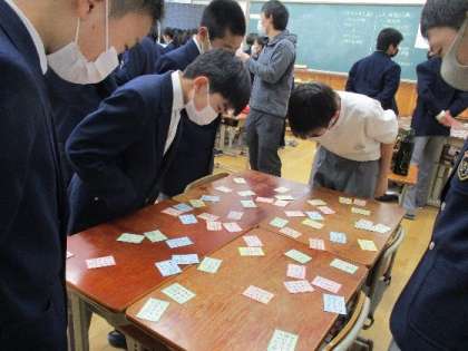 1年生は百人一首大会に向けて予選が始まりました。各クラスで担任の先生主導で進められました。自分の得意な札が読まれると、大騒ぎして取る人やニヤッとして静かに取る人とさまざまな戦いが繰り広げられていました。苦手に人は、あきらめずに最後まで頑張りましょう。まだ本番まで時間があります。1枚でも多く取れるように覚えましょう!!!