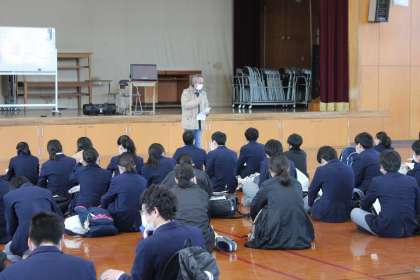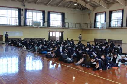 いよいよ明日から私学入試が始まります。体育館に集まり,配布プリントを使って最終確認を行いました。進路指導の先生から,冗談も交えながらリラックスできるようなお話しをして頂きました。詳細な内容は,プリントに記入してありますので,以下の点のみ確認します。