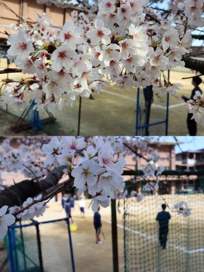 テニスコート横の桜がまもなく満開になりそうです。