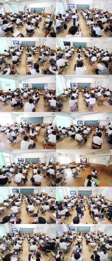 例年は体育館に全校生徒が集まり、今年度の生徒会活動について討議を行うのですが、新型コロナウイルス感染防止対策として多目的室をメイン会場としてオンラインで行いました。