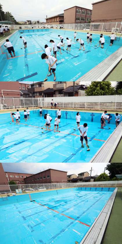 水泳の授業に向けて、プール清掃(プール本体)を行いました。