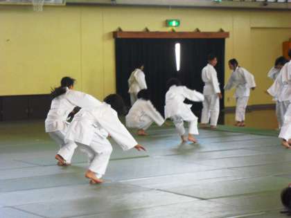 体育の授業で取り組んでいる柔道。1年生女子の大多数の生徒が初めての体験。柔道を行うにあたっての心構え,基本動作・基本的な技の学習に,少し腰が引けながらも新鮮で引き締まった気持ちをもって励んでいます。