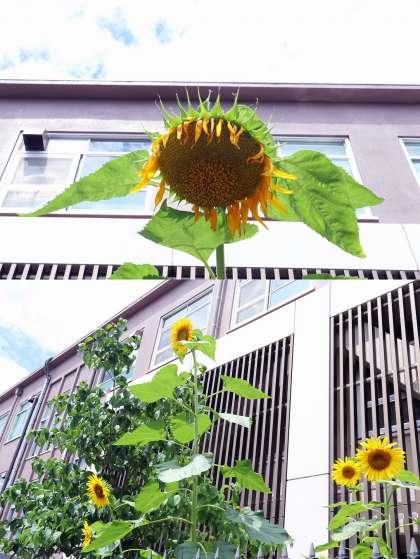 昇降口前の「はるかのひまわり」1号が6月27日に開花しました。
