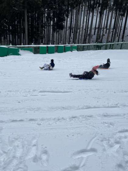 今日の午前中は、たくさん降り積もった雪の中、昨日よりも更に山の中へ進み、高い所からレベルアップしたそり遊びを楽しみました!