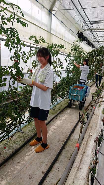 トマト栽培のハウスで収穫中です!ちょっとつまみ食いもありです。