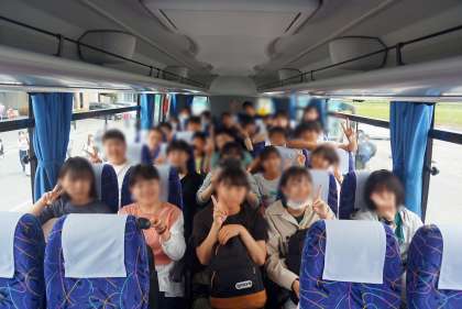 バスで柳川に向かいます。まだまだ元気いっぱいです。