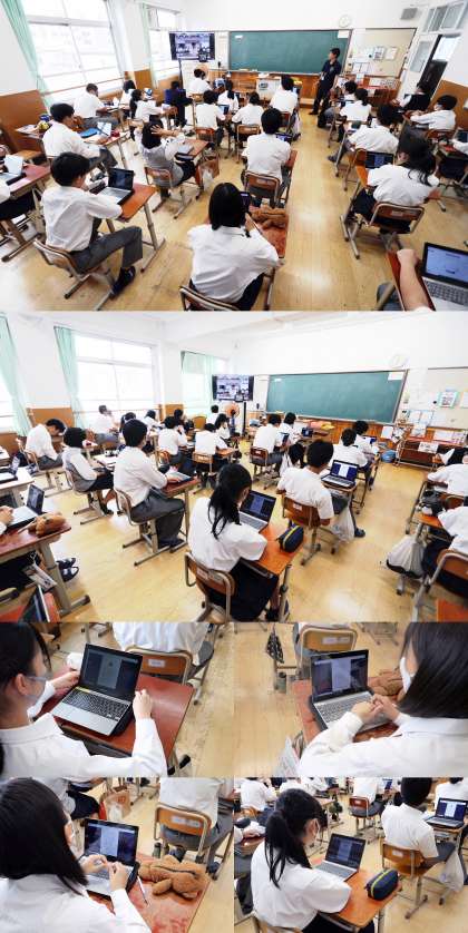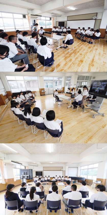 各教室では、電子化された議案書をタブレットで見ながら、議事進行を大型モニターで見ていました。