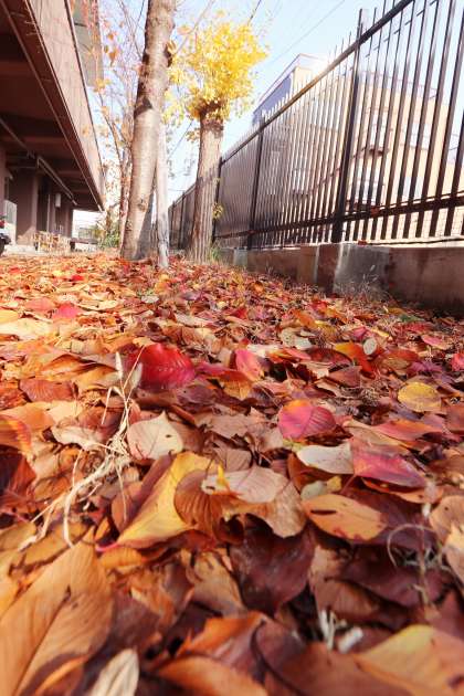 枝に少し残った「イチョウ」の葉の「黄色」と、落葉の「赤茶色」が冬の訪れを感じさせます。(掃除をするのが大変です。)