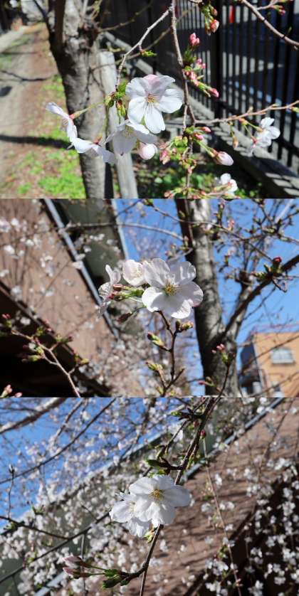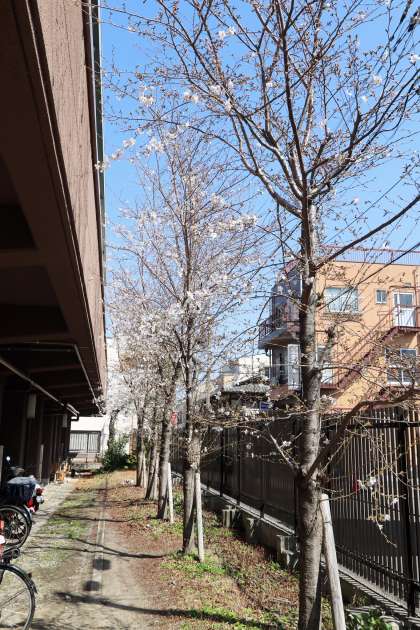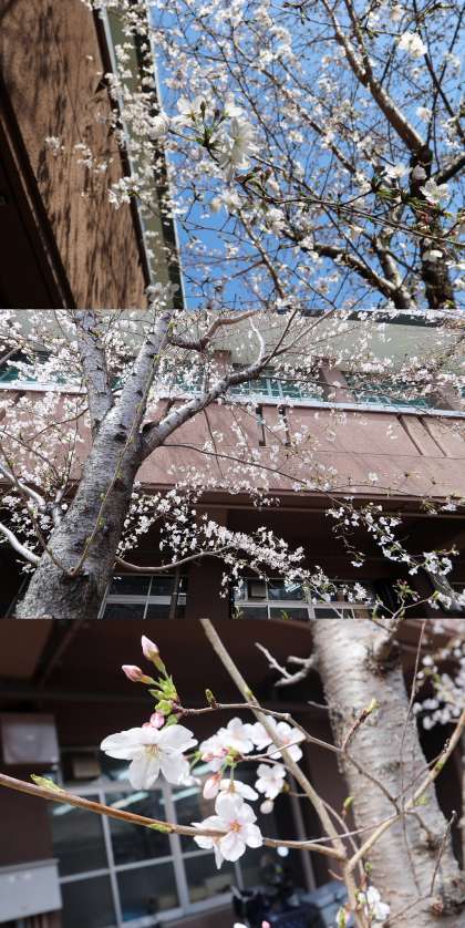校門横(体育館東側)の桜が、どの木も咲き始め、三分咲きの状態です。
