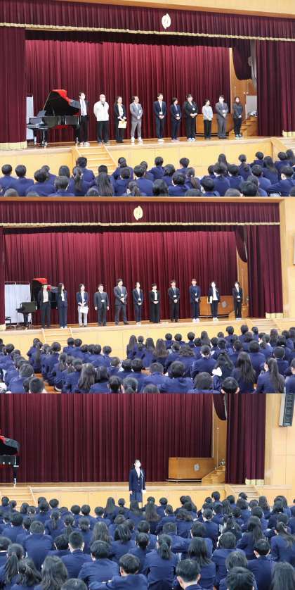 体育館で着任式と始業式を行いました。まず、着任式を行い、9名の教職員をお迎えしました。生徒代表の歓迎の言葉で式を終えました。