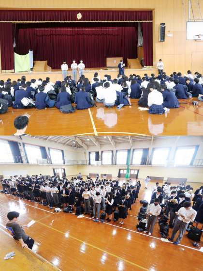 明日の朝集合時間が早いので、本日5時間目に前日指導と結団式を体育館で行いました。