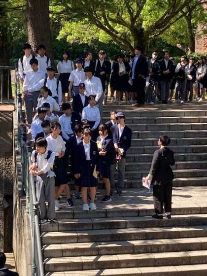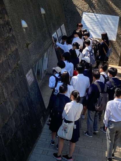 平和セレモニー終了後、「爆心地」「旧浦上天主堂遺壁」「被爆当時の地層」を見学しながら原爆資料館に向かいました。
