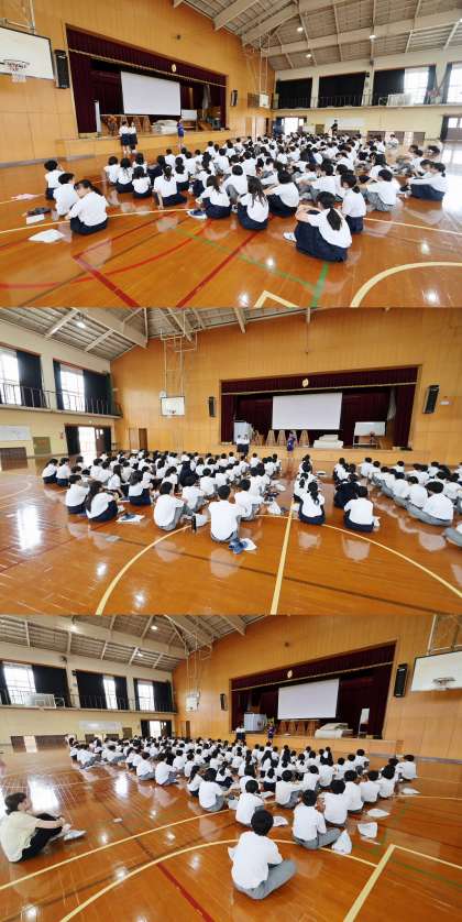 1年生は4限に1学期最終の学年集会を体育館で行いました。