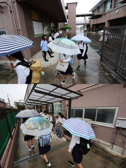 今日は保健美化委員会が担当です。雨にも負けず、朝の校門に立ち、挨拶運動を行いました。