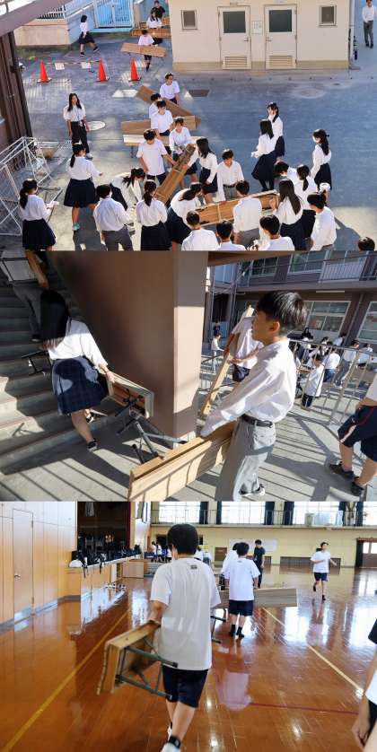 担当の委員会ごとに、長椅子をプールサイドから運び出す。雑巾で泥を拭き取る。体育館舞台下に格納する。等分業で行っていました。