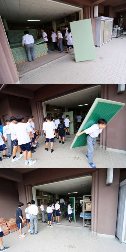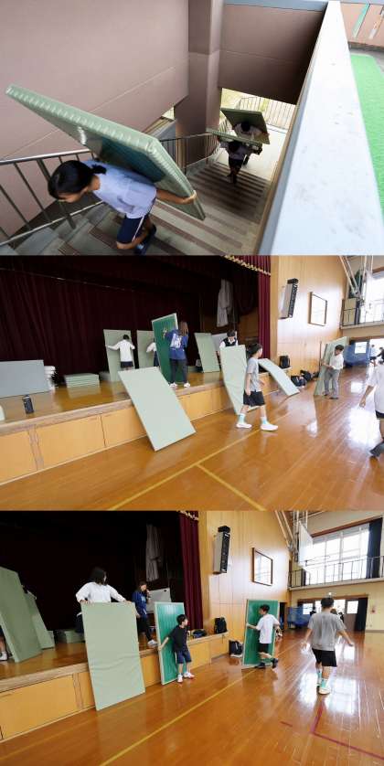 体育館に毎朝畳を敷き授業、授業が終わると畳を上げて部活動、と体育館をフル活用しています。