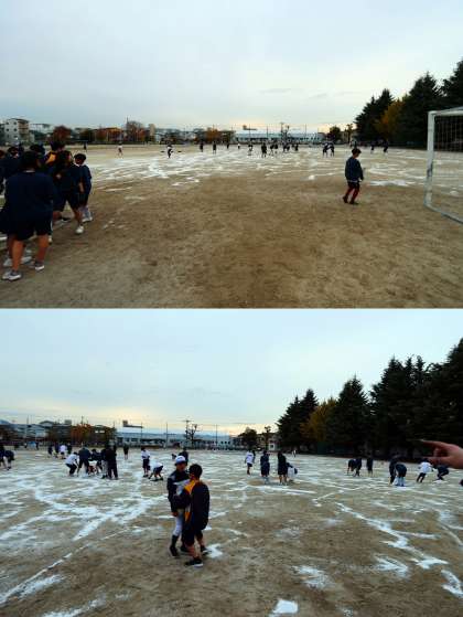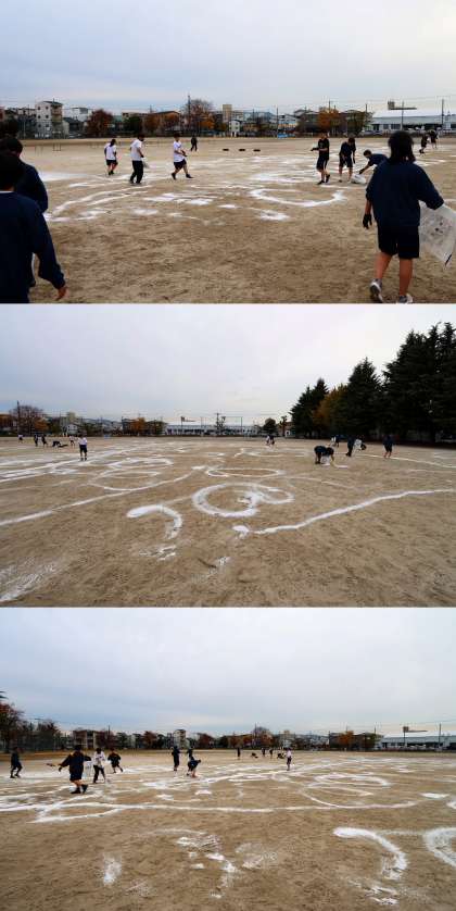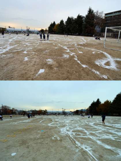 放課後、体育委員と部活動部員が協力して、グラウンドに凍結防止剤を散布してくれました。