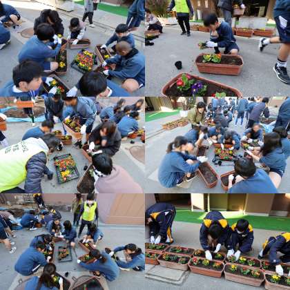 放課後、1・2年生の「花の苗植えボランティア」がプランタに花の苗を植えてくれました。今年は「パンジー」が品薄で手に入らず、最近は流行の「プリムラジュリアン」を植えました。