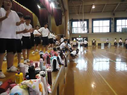 7月4日(木) 5・6限の時間を使って2年生の球技大会を実施しました。あいにくの雨でグラウンドが使えない状態となり、男女とも体育館でドッジボールを行いました。体育館を二つに分け、男女に分かれてのドッジボール大会。蒸し暑い体育館の中、異様なくらい盛り上がるドッジボールの球技大会、プレーする者応援する者、それぞれが元気いっぱい身体いっぱい試合を楽しんでいます。試合の結果、男子の優勝は5組、女子の優勝は2組、総合優勝は2組でした。学年親睦を目的とする球技大会。一生懸命取り組む姿を、一生懸命応援する姿をこれからの中学校生活にも活かせてください。