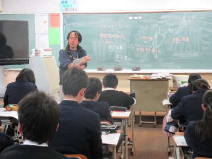 3年6組は社会。「ゆらぐ幕府の支配」の内容です。150年前の日本を実際に見てきたかのような先生の話しに,皆が引き込まれていました。
