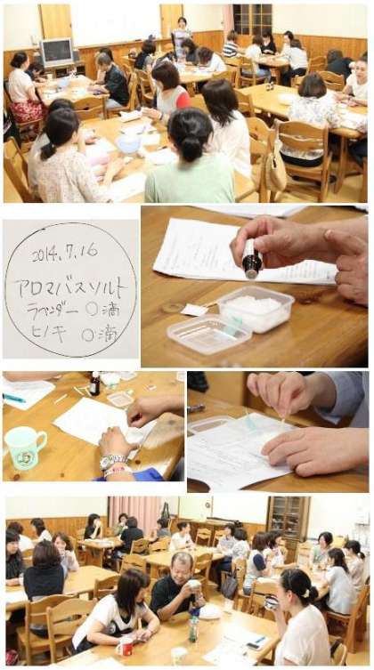 次に,バスソルトづくりの体験です。各自がつくりたい香りや効能に近づくように,数種類のエッセンシャルオイルを混ぜる量や種類を考えます。中には,受験期のお子さんのリフレッシュ効果を考えたり,家族の気になる足の疲れを軽減する効能をめざされた方もありました。