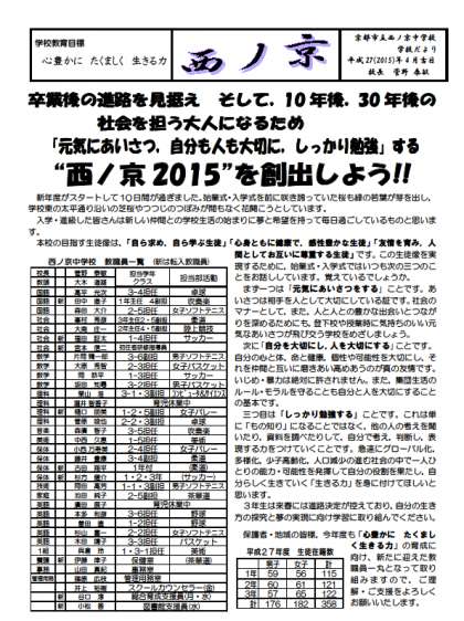 保護者・地域の皆様,今年度も「心豊かに たくましく生きる力」の育成に向け、新たに迎えた教職員一丸となって取り組みますので,ご理解・ご支援をよろしくお願いいたします。