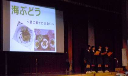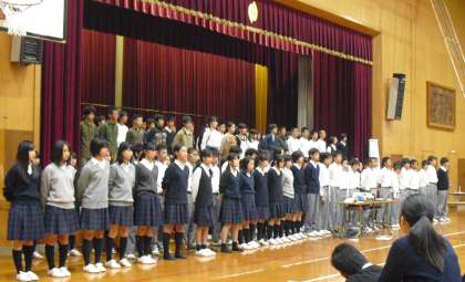 民家での宿泊で体験したことの発表,沖縄戦をテーマにした劇とコーラス,最後は全員の「平和宣言」でしめくくりました。